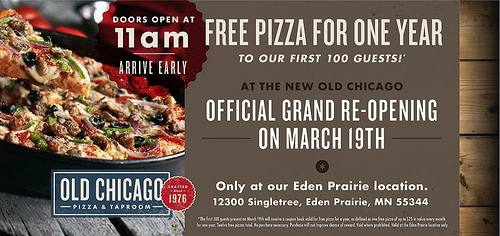 Old Chicago is re-opening their Eden Prairie restaurant which is the first of a nationwide rollout of changes to their restaurants, menus and beer selection. They’re giving out coupon books to the first 100 people Monday, March 19th at 11:00am which are worth $25 of pizza each month for 12 months…or in other words…FREE PIZZA FOR A YEAR!