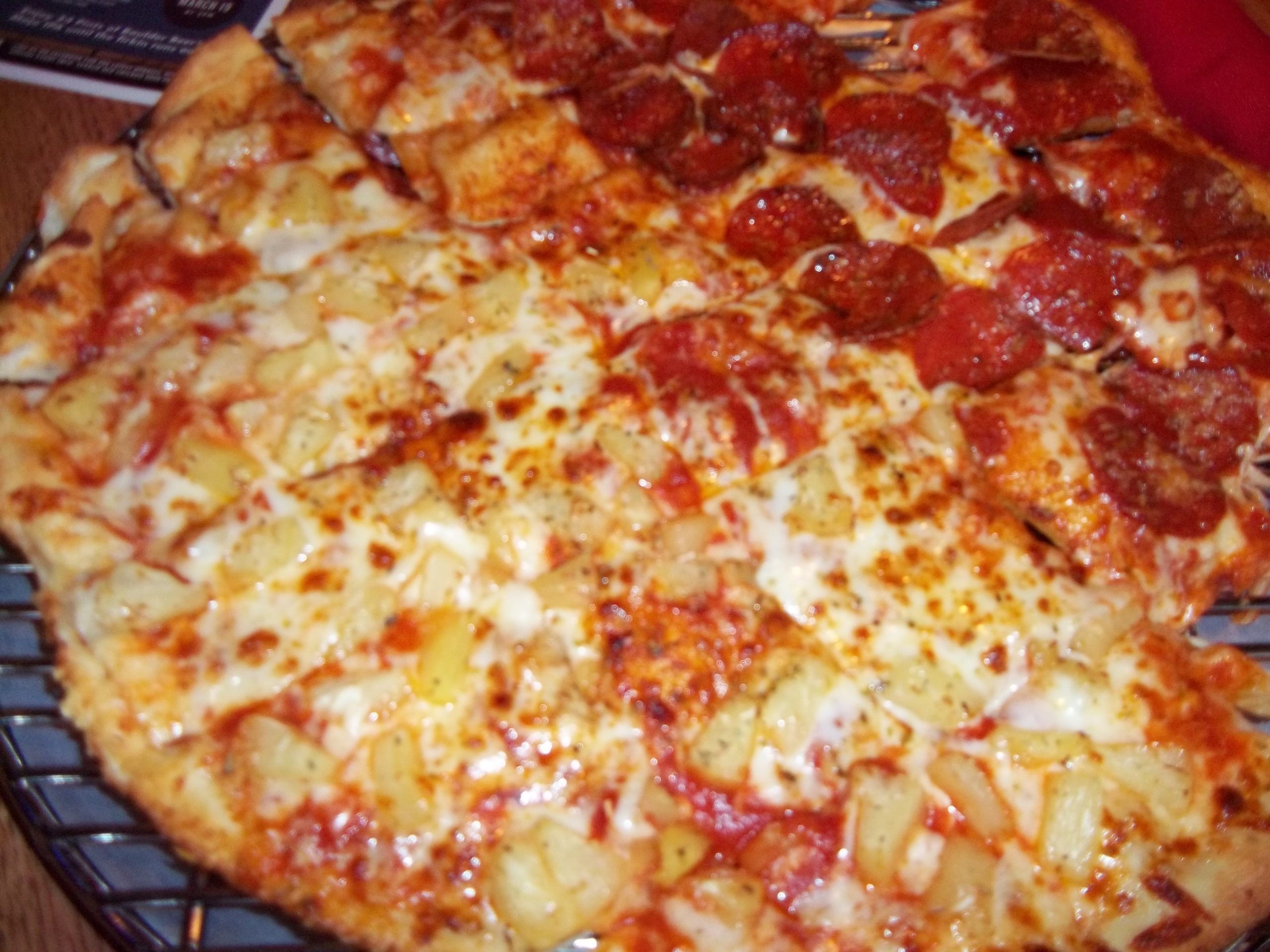 I brought leftover pizza home for my husband to eat. I was impressed with how the server handled our leftovers – she put them in a take-home box, labeled what was in it AND the date, and separated the pepperoni slices from the pineapple slices. My husband appreciated that as he ONLY eats pepperoni – and he did like it as he ate all that was left.