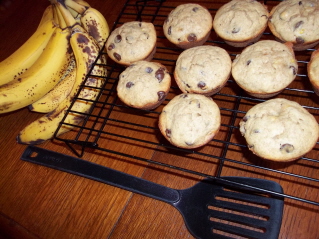 These indulgent Banana Chocolate Chip muffins make great use of those too-ripe bananas sitting in your kitchen! I got this recipe a while back from a friend, Kim.