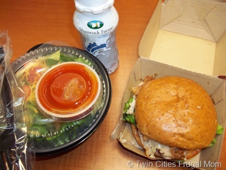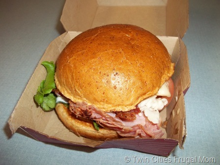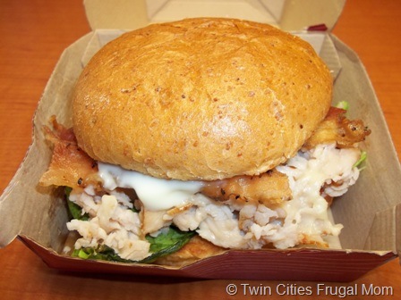 I first tried the Grand Turkey Club sandwich, which is served on a toasted wheat bun with sliced roasted turkey, melted Swiss cheese, thick pepper bacon, lettuce, tomato and mayo. It smelled soooo good in the car as I drove back to work to enjoy it and then as I took pictures before my first bite. It was warm and the turkey was surprisingly really juicy. (I heard they actually slice the meat in the restaurant.) There was a good amount of mayo and perfectly melted cheese, too.