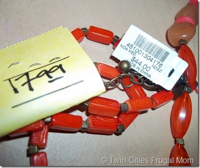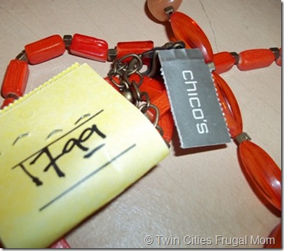 2) The Chico’s necklace I bought was also NEW with its original tag. Originally $44.00, and the Arc’s Value Village price was $17.99. But that’s not all – every day, Arc’s Value Village offers 50% off items of a certain tag color. I was there on a day when all yellow-tagged items were 50% off, so the necklace was actually $8.99! What a deal!