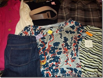 The clothes were a good variety of styles and I enjoyed trying them all on. I spent about an hour going through the clothes and mixing them up. There were some definite no’s, like a dress that looked great on the hanger but not on me (I didn’t take a picture!)! But there were several things that were surprisingly appealing to me…things I wouldn’t normally even try on. Like stripes. I don’t think I look good in them, but I actually liked this striped Ann Taylor blouse with a Gap cardigan.