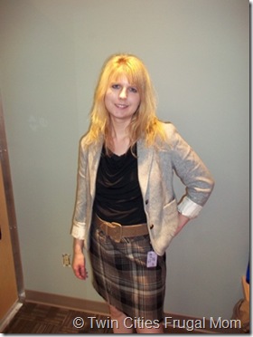 I also tried on a black New York & Company blouse with an Eddie Bauer skirt (these are two of my favorite clothing brands!) with a gray blazer…I bought the blouse and skirt but not the Blazer. I also bought the belt ($1.99).