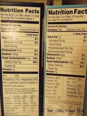 The nutrition in the pasta itself is impressive. Here’s a picture I took of some ordinary whole grain pasta we had in the house (left) next to the Sneaky Chef veggie pasta (right). Check out all the vitamins and minerals in the Sneaky Chef brand that the ordinary brand didn’t have! The winner is pretty clear here.