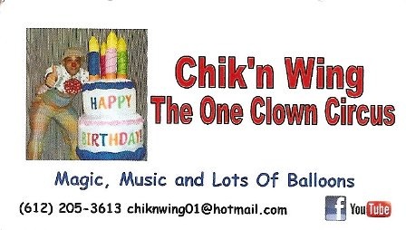 Chik’n Wing does birthday parties and other events so if you need a fun clown check out his business card here: