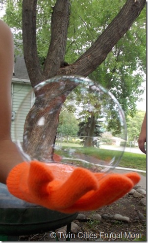 The bubble solution smelled a bit like bug repellent, but didn’t seem much different than bubble solution otherwise. The magic gloves fit kids’ hands well (though they were a little too big for our 3-year-old’s hands). They work best when they’re dry so after playing with bubbles a while they don’t work as well, but the kids liked using them.