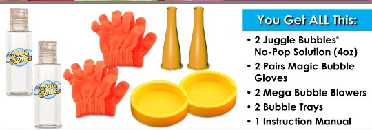 My kids tried the bubbles right away, both inside and outside. Each Juggle Bubble kit includes a bubble blower, bubble tray, unique bubble solution and a pair of magic gloves to juggle and pass each bubble.