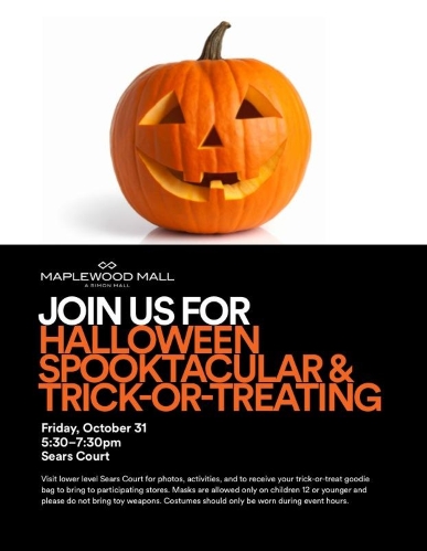 Maplewood Mall. 5:30pm. Be sure to stop by Lower Level Sears Court to pick up a trick-or-treating bag and also get your photo taken at our fun Halloween set. You will not want to miss it!