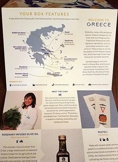 The box was visually appealing, with a booklet that provided details and tips about each item in the box, and even a map of Greece and recipes. I thought this was a nice touch.