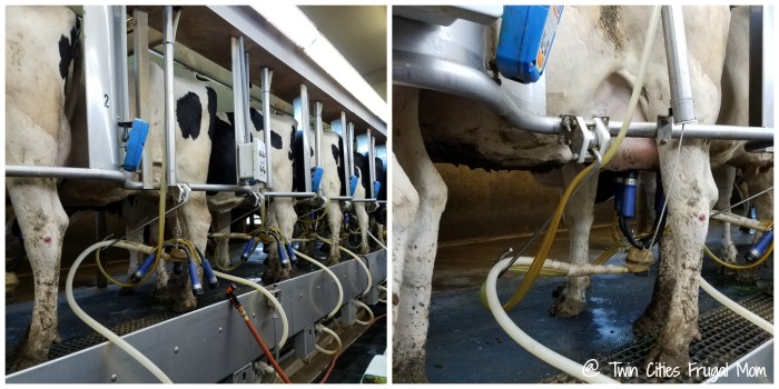 We then toured the milking parlor where the milking process is so efficient! The cows go into individual stalls and the milkers are attached to the cows. It milks the cows automatically and then releases off of the cow when it’s finished. The milk flows through sanitized pipes and then is cooled in the parlor.