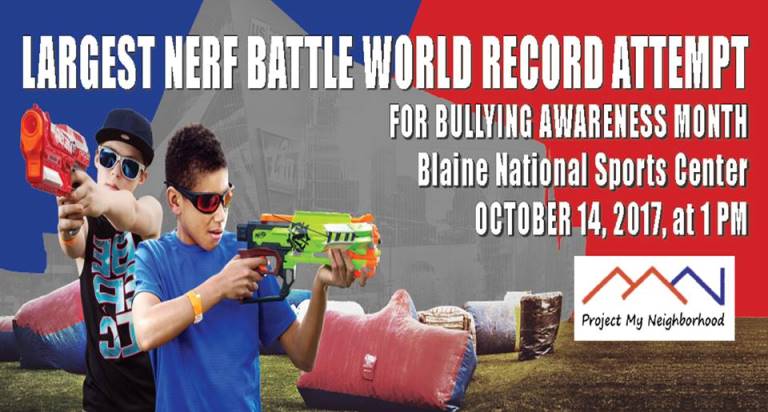 October is National Bullying Prevention Awareness Month. Project My Neighborhood is hosting their first annual Great Minnesota Nerf Battle, and they’re attempting to break the world record for largest Nerf battle – goal is to exceed 2,200 participants. Funds raised at the event will go to PACER.org for bullying prevention, to Project My Neighborhood for our scholarship and student ambassador program, and toward renting a space for consistent events all year round.