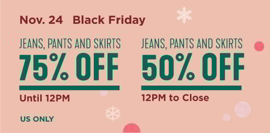 Shop on Friday, November 24th and get 75% off pre-loved jeans, pants, shorts and skirts until 12pm, and then 50% off until closing. This is a Club Member sale, so sign up at the register if you’re not yet a Member!
