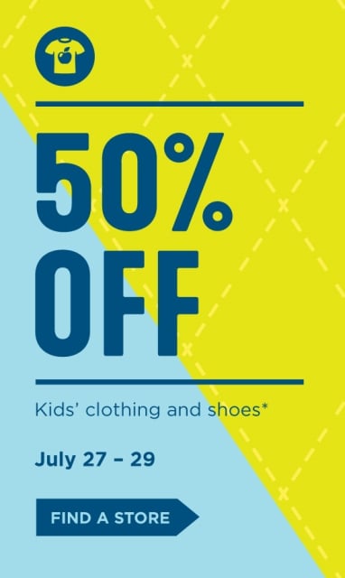 This sale includes Kids’ Clothing, Kids’ Shoes and Kids’ Accessories. Excludes new merchandise (red tags). Not valid with any other coupon or discount. US stores only.