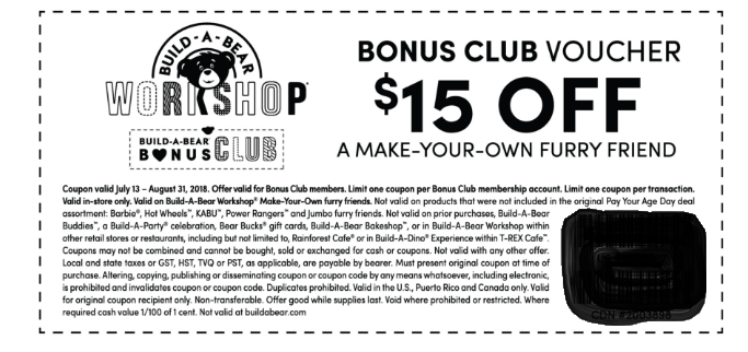 So Build-a-Bear Workshop’s “Pay Your Age Day” on July 12th was a bit busy. They closed the lines at 11:00am. Social media was busy with posts about experiences people were having waiting in lines for hours. The news shared live video at the Mall of America, showing a line going across Nickelodeon Universe. Many didn’t get a stuffed friend – many got a voucher for $15 off a future visit. Then they shared it online for anyone who signs up for their free Bonus Club. Print by July 15th, use by August 31st.