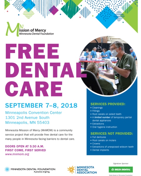 Free dental care will be available at the Minnesota Mission of Mercy community event on Friday, September 7th and Saturday, September 8th at the Minneapolis Convention Center. This event is for patients facing barriers to care and is put together by the Minnesota Dental Association and Minnesota Dental Foundation.