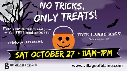 Halloween Trick-or-Treat Event. 11:00am – 1:00pm. The Village of Blaine Shopping Center, 4335 Pheasant Ridge Dr NE, Blaine. On Saturday, October 27th, The Village of Blaine Shopping Center will be hosting a free Halloween event for kids! Bring your kids in their best costumes for this Trick-or-Treat Event! Free Candy Bags* (* While supplies last).