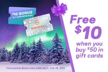 Regal Cinemas: Buy $50, get $10! For every $50 in Gift Cards purchased in-theatre, guest will receive a $10 Concessions Bonus Card. Concessions Bonus Card is redeemable towards concession purchases only (excluding any alcoholic beverages). Concessions Bonus Card is valid 1/1/2019 – 2/28/2019. This offer may not be combined with any other discounts, coupons or offers. While supplies last. (There is one Regal Cinemas location in the Twin Cities: Regal Eagan Stadium 16, 2055 Cliff Road, Eagan, MN.)