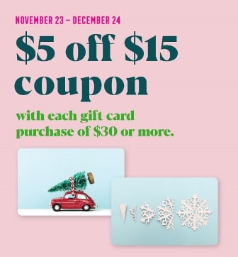 Savers: From November 23 – December 24, get a $5 off a $15 purchase coupon with each gift card purchase of $30 or more. (Give a gift card with the coupon!)