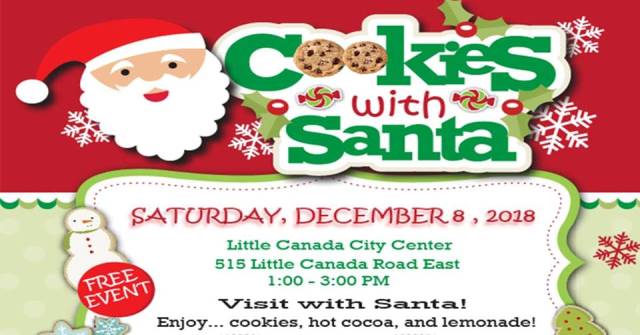 Cookies with Santa. 1:00 – 3:00pm. City of Little Canada, 515 Little Canada Road East, Little Canada. Join us for Cookies with Santa! Enjoy… cookies, hot cocoa, and lemonade! There will also be face painters and a balloon artist! This FREE event will be held at the Little Canada City Center on Saturday, December 8, 2018, from 1 – 3 PM. Make sure you bring your camera to take photos of the kids with Santa… or why not take a selfie?!