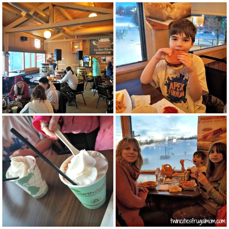 Here at the Chalet they have plenty of tables if you want to bring your own food, plus they have a quick-serve cafe and a sit-down restaurant called the Moosehead Bar & Grill. We ate here because it had a full menu with a kids menu, and great views of one of the skiing hills and of Duluth!