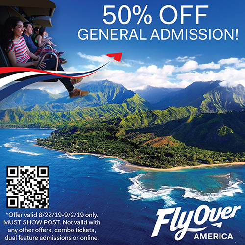 Get 50% off general admission tickets at FlyOver America! This one popped up in my Facebook feed but I couldn’t find it again on their page. However, it’s in their newsletter! Just show this info at the FlyOver America admissions counter to save. Valid on single general admission tickets from 8/22/19-9/2/19 only.