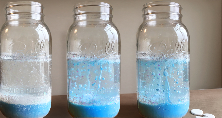This experiment works for a few reasons. Because oil is less dense than water, the water will naturally sink to the bottom of the jar. When the Alka-Seltzer is dropped into the jar, its interaction with the water creates pressure in an upward direction, and the oil pushes it back down. This pressure back and forth is part of what creates the snowstorm. The other element is the interaction between water and sodium bicarbonate in the Alka-Seltzer, which generates carbon dioxide gas. The combination of these factors creates a blizzard every time!