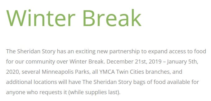 From December 21, 2019 to January 5, 2020, any YMCA of the Greater Twin Cities and several Minneapolis parks locations will have The Sheridan Story free bags of food available for anyone who requests it, while supplies last.