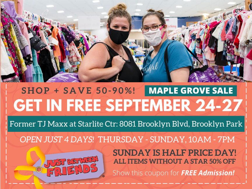 And there’s a big, safe, not-to-be-missed Just Between Friends Fall Kids Sale coming up September 24 – 27, 2020 in Brooklyn Park!