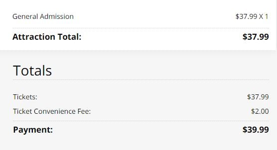 Here is what it looks like purchasing 1 ticket on my discounted ticket page. The total is $39.99.