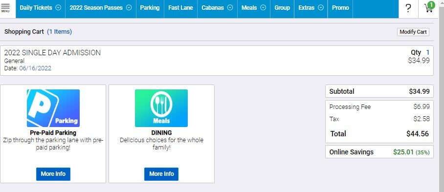 Here is the SAME purchase on Valleyfair’s ticket page. See how much higher the added charges are? The total is $44.56.