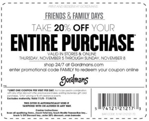 Gordmans Exclusive Friends & Family Days 20% Off Printable Coupon! Valid Nov 5 – 8!