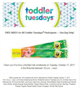 Free Nickelodeon Universe 5-Hour Ride Wristbands for Toddler Tuesday on October 17