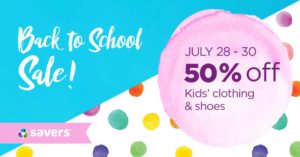 It’s back to school shopping time, which also means – back to school sales! Yay for that (saving money that is). One sale I won’t miss is this weekend’s 50% off kids clothing & shoes sale at Savers, Friday, July 28th – Sunday, July 30th.