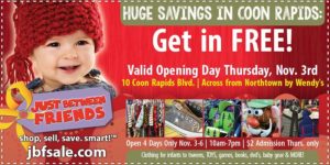 Just Between Friends Coon Rapids Fall Kids Marketplace Nov 3 – 6 & Free Admission Coupon
