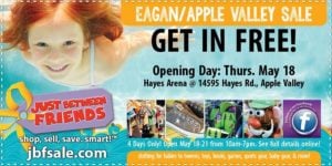Just Between Friends Eagan Apple Valley Spring Kids’ Consignment Sale May 18 – 21 (Free Admission Ticket for Opening Day)