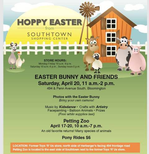 Easter Event & Petting Zoo at Southtown. 11:00 AM to 2:00 PM. Southtown Shopping Center, 7801 Penn Ave S, Bloomington. The Easter Bunny will be available for photos so bring your own camera. Music by Kidsdance, Crafts with Artistry, facepainting, balloon animals and a small stuffed animal for each child in attendance (while supplies last).