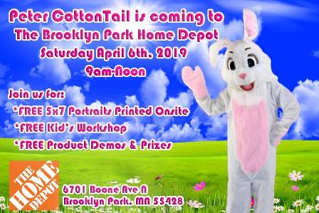 6701 Boone Ave North, Brooklyn Park. Come for a FREE Portrait with Peter CottonTail, FREE Kid’s Workshop, FREE Product Demos and FREE Family Fun. This event is brought to you by The Home Depot in Brooklyn Park.